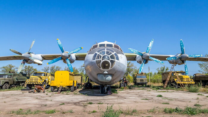 Пару лет назад мне удалось побывать на учебном аэродроме Смышляевка в Самаре. Одним из "экспонатов" аэродрома является самолет Ан-12, с регистрационным номером СССР-11339. Заводской номер машины 2400505, он выпущен в апреле 1962 года на авиазаводе в Воронеже. Вообще самолеты Ан-12 выпускались на трех авиазаводах: в Иркутске, Воронеже и Ташкенте. Больше всего выпущено в Ташкенте, в период с 1962 по 1972 год изготовлено 830 машин. В Воронеже с 1960 по 1965 год - 258 машин и 155 машин в Иркутске в период с 1957 по 1962 год. Самолет модификации Ан-12Б отличается от базовой усиленным центропланом, большим объемом топлива и наличием турбогенератора ТГ-16. Кабина пилотов, за исключением некоторых приборов - комплектная. Кабина штурмана. Самолет эксплуатировался с 1962 года, первоначально в Управлении полярной авиации, затем был передан в Приволжское УГА. 30 декабря 1976 года был списан по отработке назначенного ресурса. До 1983 года на нем проводились газовки всех двигателей. В настоящее врем