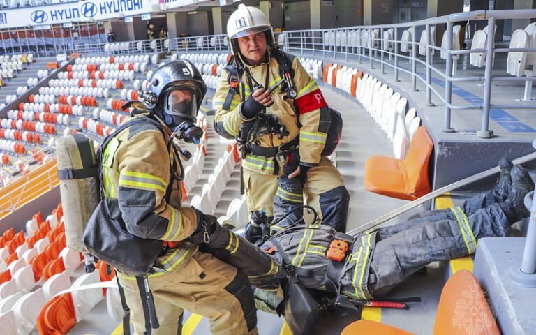 В Саранске стадион “Мордовия Арена” оказался в эпицентре внимания экстренных служб. По легенде учений, на трибуне сектора “В” из-за нарушений пожарной безопасности при использовании фаеров началось возгорание. При этом пожар по вентиляции мог распространиться на нижние этажи.