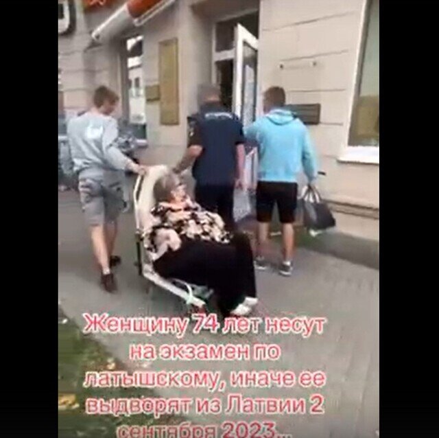 24 июля 74-летнюю женщину на носилках доставили на экзамен, так как самостоятельно она передвигаться не может. Ей нужно было продемонстрировать свои знания латышского языка и получить сертификат на категорию A2. Если она не сделает этого до 1 сентября, её вид на ПМЖ будет аннулирован. Взамен она получит временный вид на жительство сроком на один год. После этого ей предстоит либо выучить латышский язык, либо отправиться жить в другую страну, пишет «Южная служба новостей». В сети также опубликован ролик, на котором видно, как отправлялась пенсионерка на экзамен. За кадром женщина говорит о том, что много людей сдают экзамен на знание языка Латвии. Работают четыре кабинета, в одном принимают добрые люди, в другом – не очень, зависит от того, в какой попадёшь. Известно, что 74-летняя пенсионерка не единственная, кому пришлось сдавать экзамен в пожилом возрасте. Одной 67-летней женщине нужно было ехать до места проведения экзамена из другого города. У неё имеются проблемы со здоровьем. Ран