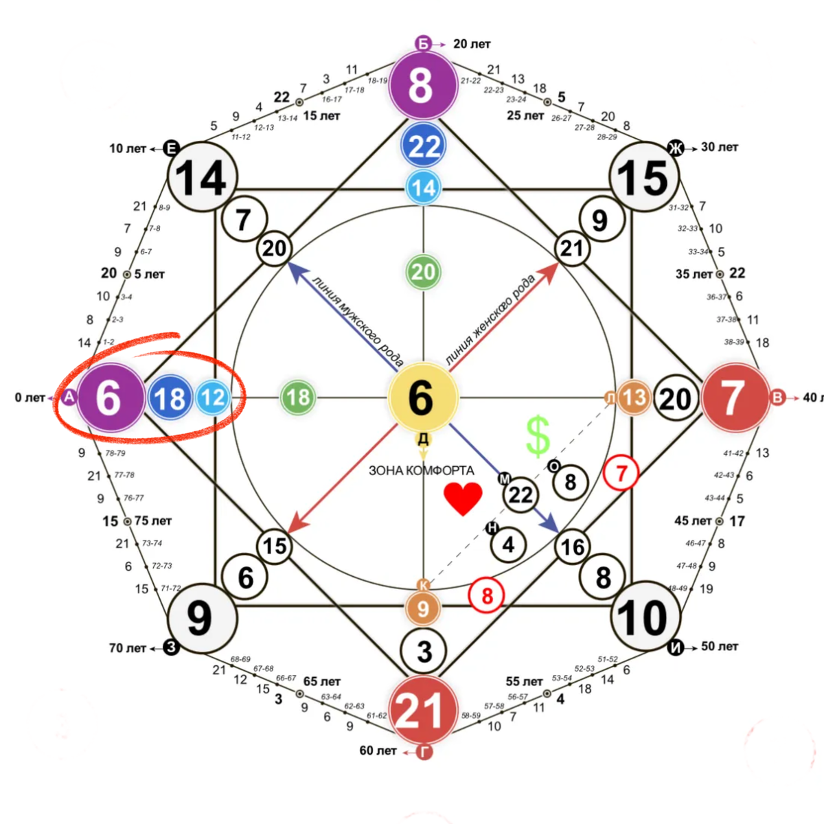 За это у нас отвечает фиолетовый кружок, который представляет из себя день рождения и два последующих кружка. Это сочетание трех арканов и будет ваш портрет личности.