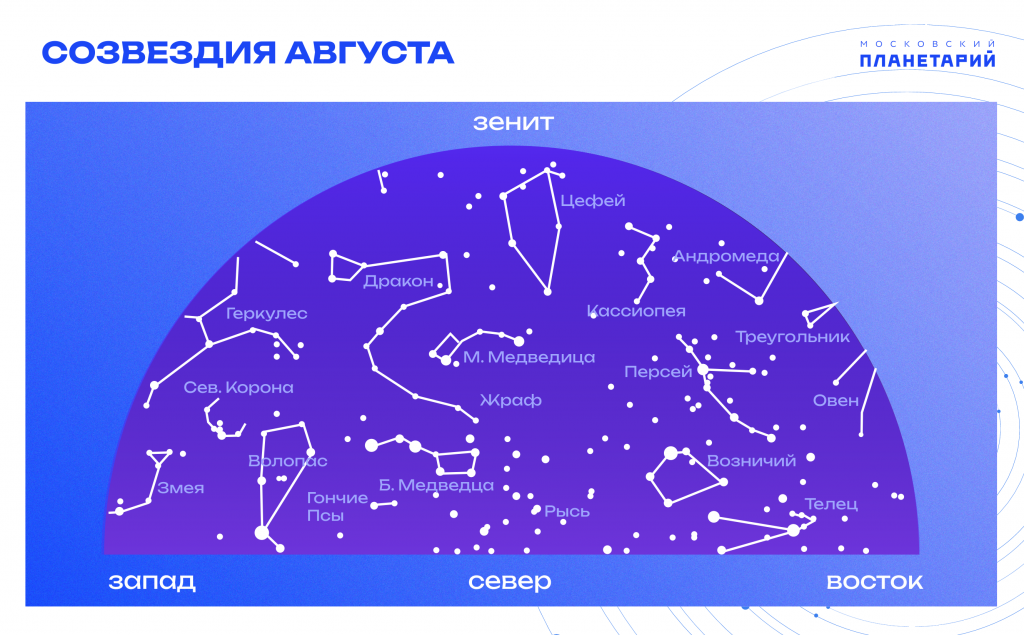 В области зенита располагаются созвездие Цефей, к востоку от него – Кассиопея, ниже – Персей. На северо-востоке – красавица Кассиопея, Персей и Возничий, а у горизонта – Телец. В южной части неба доминирует Летний Треугольник, образованный яркими звездами Вегой, Денебом и Альтаиром – главными светочами созвездий Лиры, Лебедя и Орла, а вблизи горизонта – Змееносец. В этой же части неба видны небольшие, но очень интересные созвездия Стрела, Лисичка и Дельфин. У самого горизонта расположились южные созвездия Стрелец и Козерог. В юго-восточной области неба на большой высоте – Андромеда и Пегас, а вблизи горизонта – Рыбы и Кит. К западу от зенита – Дракон, Геркулес и Змееносец. Млечный Путь тянется с юга к северо-востоку, проходя вблизи зенита.