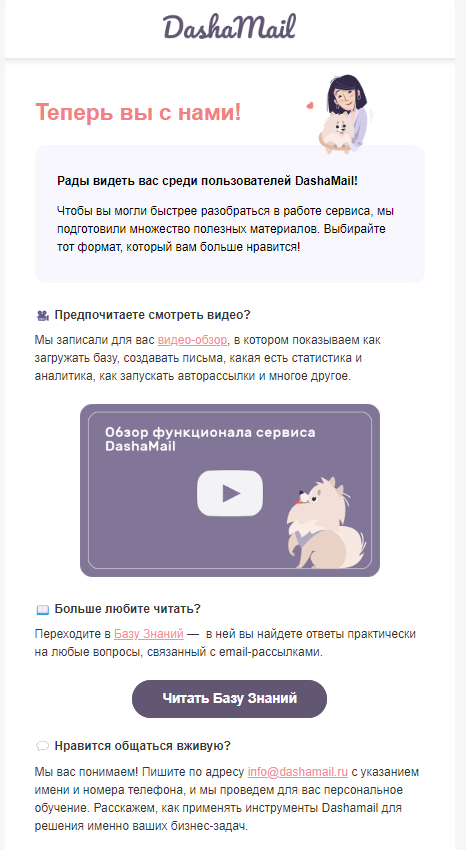 В качестве примера рассмотрим приветственное письмо сервиса DashaMail. Его главная цель - обучить нового пользователя работе с сервисом. Подписчику демонстрируются основные функции и выгоды сервиса, даются полезные советы по использованию и специальные предложения. Такой подход не только упрощает процесс адаптации нового пользователя, но и стимулирует его к совершению первой покупки, закладывая основу для долгосрочных отношений.