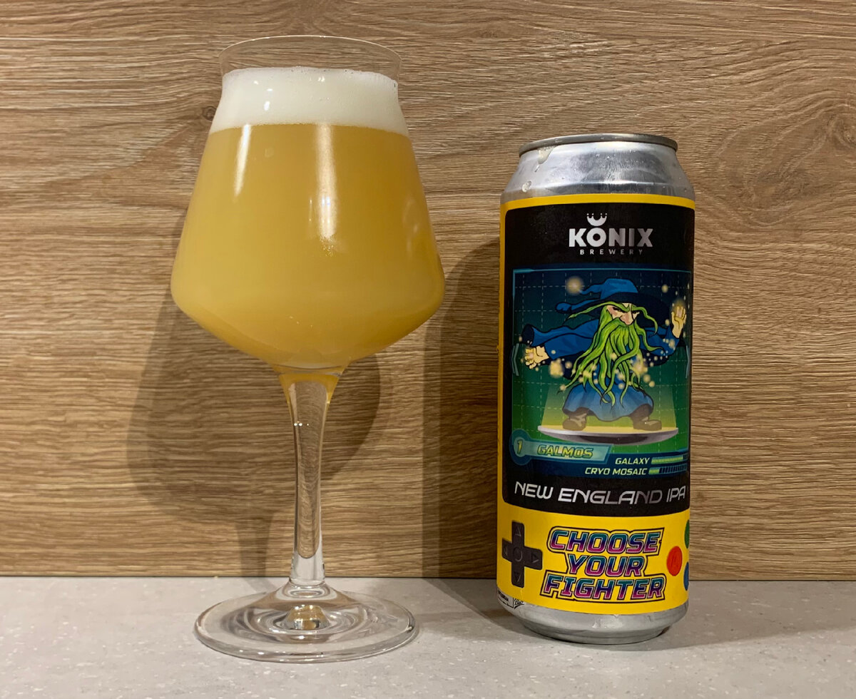 Konix недавно начали выпускать серию "мутняков" Choose Your Fighter, первым появился Galmos, название взято у первых частей имен использовавшихся хмелей: австралийского Galaxy и американского Mosaic в варианте cryo, то есть спрессованный порошок лупулина с повышенным содержанием смол и ароматических масел, чем у стандартного варианта. В составе еще указаны овсяные хлопья и поваренная соль, что странно, второй ингредиент либо ошибка, оставшаяся на этикетке после другого сорта типа гозе, либо пивовары придумали что-то новое.
