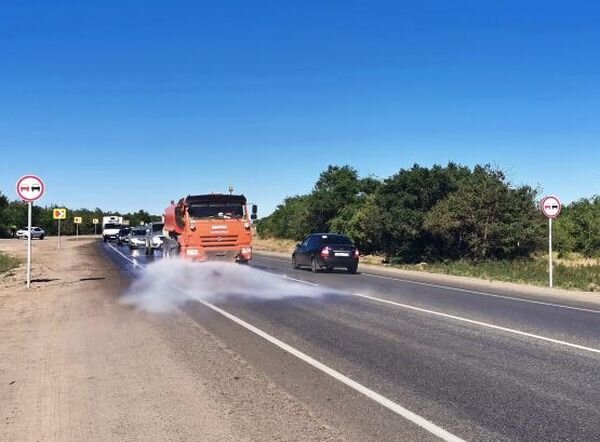 Дорогу проливают, а вдоль нее делают защитные полосы Дорожники на трассе М-4 «Дон» в Волгоградской и Ростовской областях в связи с жарой проливают проезжую часть в наиболее опасных местах — на спусках, подъемах, местах разгона и торможения, сообщили в пресс-службе ФКУ Упрдор «Москва-Волгоград».
