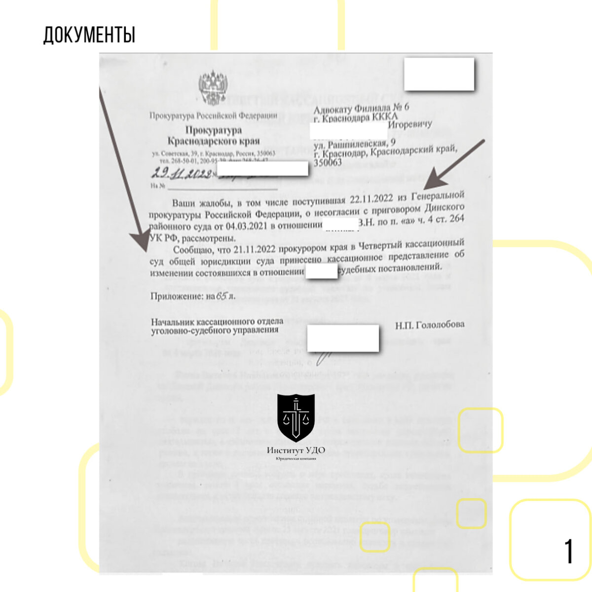 Судом кассационной инстанции 4 кассационного суда Общей Юрисдикции Нам было отказано в передаче кассационной жалобы, несмотря на то, что до этого самому осужденному тоже было отказано у нас приняли повторную, рассмотрели и отказали в удовлетворении. То есть суд второй раз рассмотрел жалобу. Но отказал. А мы не стали обращаться в Верховный Суд РФ, тратить время на получение судебных актов, а отправили жалобы на приговор в Генеральную Прокуратуру и Прокуратуру Края, поскольку в данном случае достаточно только ксерокопий обжалуемых судебных актов.