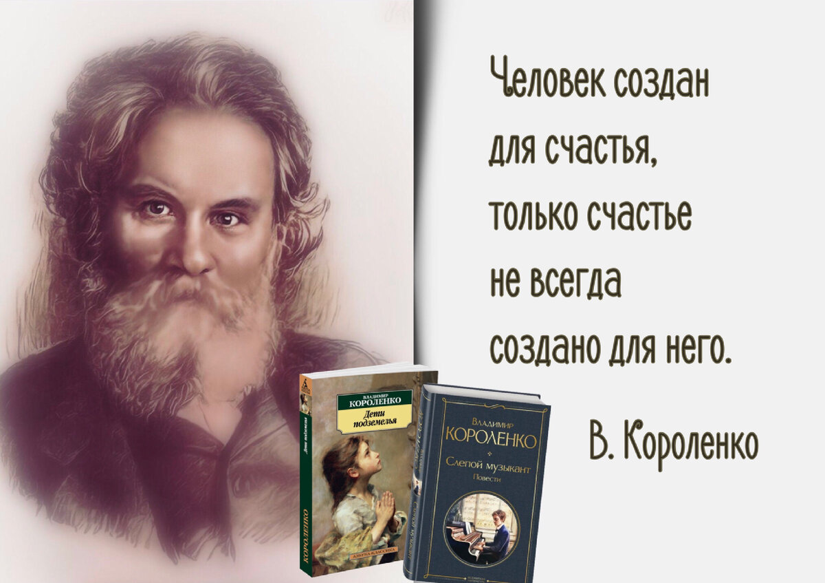 Каждый из нас помнит ещё со школьной скамьи – «Человек рожден для счастья, как птица для полета». Вопреки расхожему мнению, приписывающему фразу Максиму Горькому, изречение принадлежит перу Владимира Галактионовича Короленко: оно из очерка «Парадокс», его пишет ногой калека, безрукий от рождения. Не лучшая ли это характеристика творчества писателя, которого любили и уважали все – от Чехова до Луначарского?