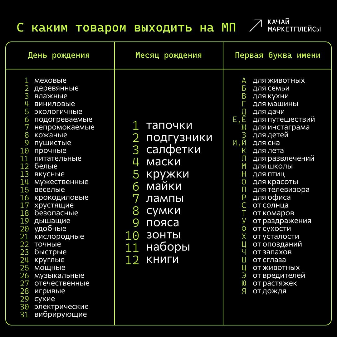 Самый популярный вопрос у тех, кто только собирается на маркетплейс какой? Правильно! С каким товаром выходить?! Мы решили тебе помочь. Держи пошаговую инструкцию в лучших традициях Качай Маркетплейсы. Это лучше астрологии. Просто подбери себе товар по дате рождения и имени 👌 Пиши в комментариях, что у тебя получилось 😉