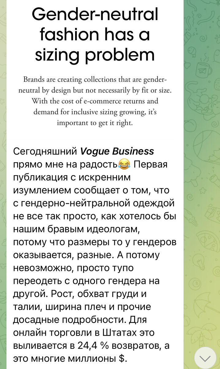 На фоне повесточки Диснея и Барби почти незамеченной прошла новость: на Западе начали терять миллионы миллиардов западных денех те бренды, которые тоже заигрались в «толерантность». Выяснилось, что когда девочки покупают гендерно нейтральную одежду, она на них плохо сидит. Соответственно, чаще всего они сдают на возврат заказы в «толерантных» интернет-магазинах. А мальчики покупать гендерно нейтральную одежду вообще не хотят. Видимо, где-то не там жмёт. Что, серьезно? А до того, как на четверть уронили продажи, не задумывались над тем, что мальчики от девочек реально отличаются?