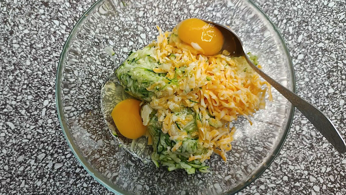 Сегодня я заглянула в холодильник и поняла: пора устраивать доедалкин день. Можно было выставить кучу маленьких тарелочек и плошечек, но я решила по-другому пристроить остатки еды. Сейчас расскажу, как я это делаю. Надеюсь на взаимность, жду ваши варианты утилизации остатков. Кабачков сейчас много, и сегодня они мне очень помогут. ✅ Начну с того, что натру кабачок на крупной тёрке. У меня 500 гр. Добавлю немного соли, перемешаю и оставлю на 5 минут. Кабачок должен отдать лишнюю влагу. ✅ Сама тем временем натру на крупной тёрке 100 граммов сыра и дольку чеснока на мелкой тёрке. ✅ Кабачки немного постояли, теперь можно отжать сок. Я взвесила уже отжатый кабачок, получилось 350 гр. вместо 500. ✅ Добавлю к отжатому кабачку натёртый сыр, чеснок, 2 яйца и 130 граммов муки, я использую цельнозерновую пшеничную муку. ✅ Всё хорошо перемешаю, должно получиться более или менее однородное тесто. Форму для запекания я застелила бумагой для выпечки, к моей бумаге ничего не липнет, поэтому я её ниче