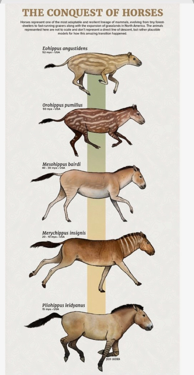Современная лошадь, Equus caballus, относится к семейству лошадиных отряда непарнокопытных (Eguidae) и образует вместе с ослами, полуослами и зебрами род Eguus. 🙋🏽 Equidae вместе с тапирами и носорогами являются потомками группы давно вымерших примитивных млекопитающих Condylarthra, от которых произошли все копытные. Предки лошади на этапах этой эволюции жили в основном на американском континенте, но в последствии были там истреблены и остались преимущественно на евроазиатском континенте. История лошади насчитывает 60 млн. лет. Самый древний лошадеподобный предок сегодняшних лошадей, ослов и зебр жил около 54 млн. лет назад.⏳ Сначала учёные назвали его эогиппусом👩💻, так как жил он в эоцене, но потом переименовали в гиракотерия💁🏻♀️. Одним из первых представителей этого рода, уже давно исчезнувшего в бесконечном море минувшего, был орогиппус😲, живший в среднем эоцене третичного периода. Эти маленькие, высотой менее полуметра, лошадки, стояли в самом начале эволюционной це