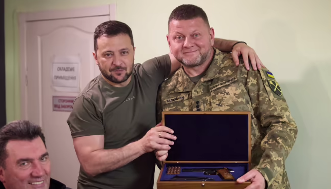Президент Украины Владимир Зеленский на очередном заседании ставки Верховного главнокомандующего выступил с поздравлением Главнокомандующего Вооружённых сил Украины Валерия Залужного и Командующего Сухопутными войсками Александра Сырского с их прошедшими Днями рождения. Оба украинских генерала родились в июле: Залужный - 8 июля, Сырский - 26 июля. В честь этого украинский президент вручил военным командирам подарки. Валерий Залужный получил именное огнестрельное оружие, а Александр Сырский картину, которая, по словам Зеленского, «которая отражает подвиг украинских воинов и уважение к ним» Вышеупомянутая картинаПримечательно, что Залужный получил от Зеленского модель пистолета украинского производства «Форт» с элементами позолоты, хотя законодательство страны допускает вручение и пистолет-пулемётов, винтовок того же производителя. Стоит отметить, что долгое время ходили слухи о гибели Главнокомандующего Вооружённых сил Украины Валерии Залужном, которые казались всё правдивее после недос
