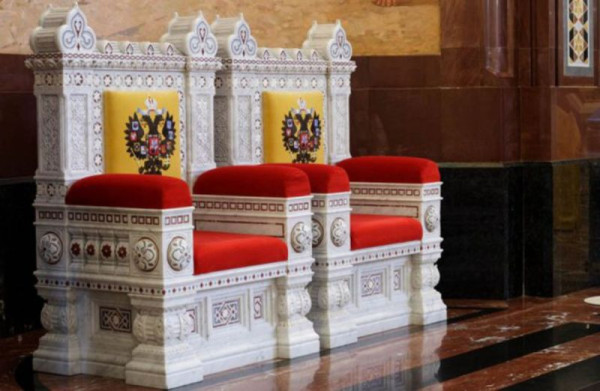И второй момент: вот эти царские престолы в храме. Для кого они поставлены? Чьих августейших седалищ ожидает эта мягкая мебель? Как известно, «если в первом акте на сцене висит ружьё, то в последнем оно должно выстрелить». Если в главном храме страны поставлены царские троны, то в конце концов
