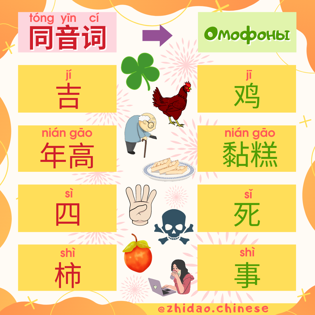 #zhidao_омофоны Сегодня предлагаем вам еще одну подборку омофонов (同音词 tóngyīncí)! 📣 В китайском языке множество слов, состоящих из одинаковых звуков, но если произнести их разными тонами, то значение может кардинально поменяться, а иногда два слова могут произноситься абсолютно одинаково, но записываться разными иероглифами и иметь разные значения 🙊 🔊 Открывайте видео и включайте звук, чтобы услышать, как произносится каждое слово! 🔸吉 jí удача 🔹鸡 jī курица 🔸年高 nián gāo старый, преклонных лет 🔹黏糕 nián gāo торт из клейкого риса 🔸四 sì четыре 🔹死 sǐ смерть 🔸柿 shì хурма 🔹事 shì дела 📝 Ссылка на карточки Quizlet для изучения новых слов: 📚 Хотите, чтобы Вы или Ваш ребенок заговорили на китайском? Напишите нам для записи на групповые / индивидуальные занятия! 🎓