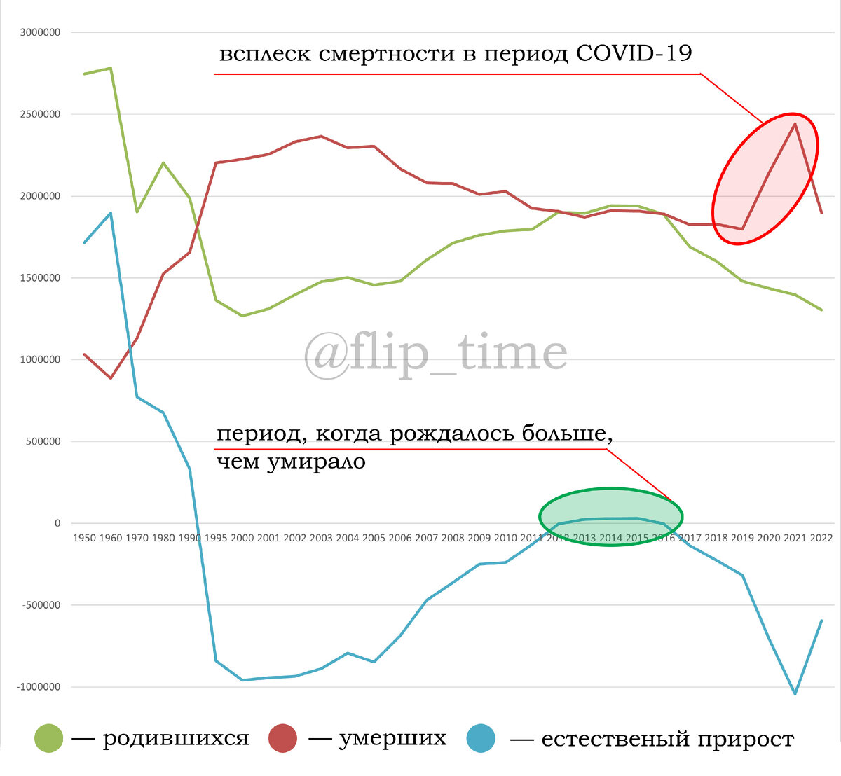 После демографического провала в 90-x, рост численности населения России, хоть и был в отрицательных значениях, но медленно рос (до 2015 года). Вы увидите это, если обратите внимание на график к посту (синяя полоса - естественный прирост населения).