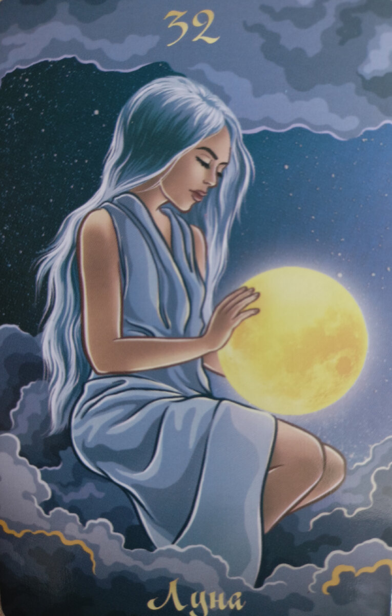 Медитация и размышление, интуитивность восприятия окружающего мира, анализ прошлого, чтобы понять настоящее. Луна мало чем напоминает аналогичную карту из расклада Таро и в основном символизирует потребность в размышлениях с целью интуитивного осознания своего места в жизни и оценки прошлого, как источника и предтечи текущих событий и вообще нестоящего. Возможно вам стоит погрузиться в медитацию и поискать себя в ощущениях и эмоциях, глубже заглянуть в подсознание и постараться взглянуть на всё происходящее со стороны. Наше ночное светило постоянно меняет свою форму, проходя через фазы роста и убывания, отсюда одноимённой карте присуща символика развития, трансформации и конечно же женского начала. Это же даёт аркану два направления в значениях. Первое говорит о стремлении к миру наслаждений и поиску приключений, а второе гораздо более спокойное, советует просто отдохнуть от всего и погрузиться в свой внутренний мир, предавшись размышлениям. Снимите с себя груз прошлого, доверьтесь сво
