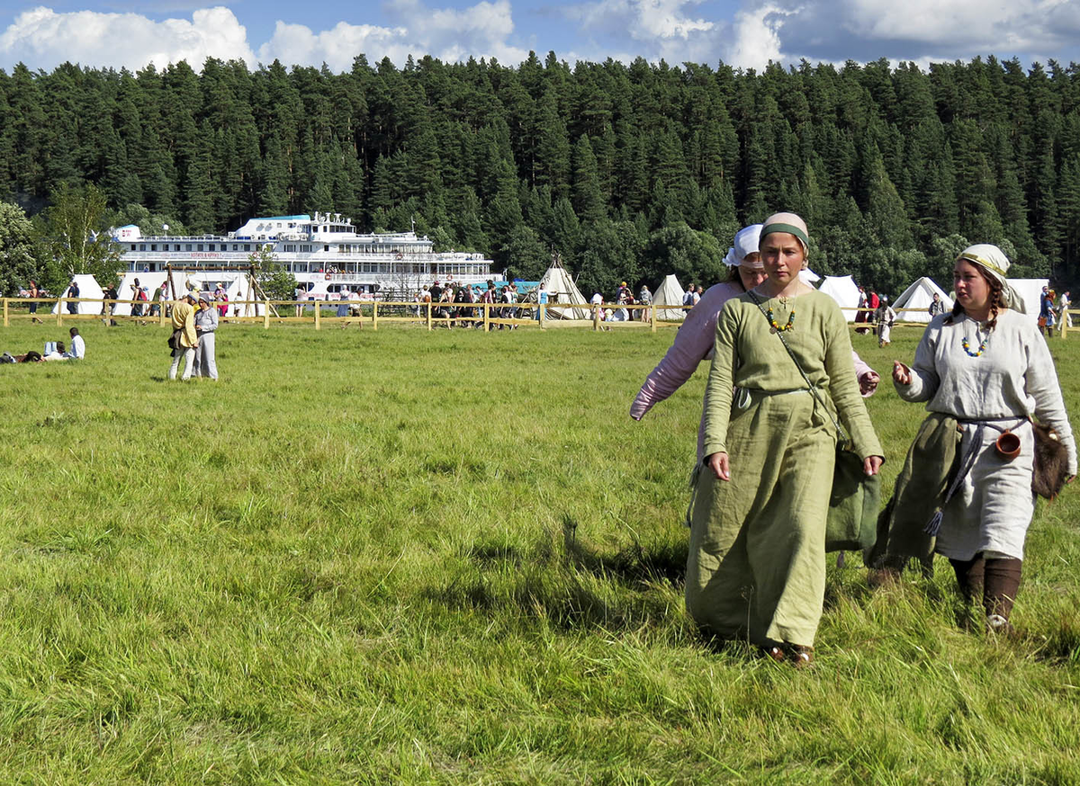 Куда проще, чем события тех далёких времён, воссоздать их быт по находкам из городищ и курганов. Чем и занимается немалая часть реконструкторов: даже сайт "Былинного берега" красноречиво называется 10vek.ru. Ну а место для фестиваля основатель и соорганизатор Антон Жерягин присмотрел как раз там, где пути с Балтики входили в Волгу. Первоначально, в 2011-13 годах, "Былинный берег" проводился на окраине Кимр, затем ещё несколько лет - на реке чуть ниже Кимр, а в 2016-м наконец осел между Кимрами и Дубной на длинной стрелке у заволжской деревни Топорок. В месте более чем историческом - соседняя деревня Пекуново примечательна вполне достоверными варяжским курганами.