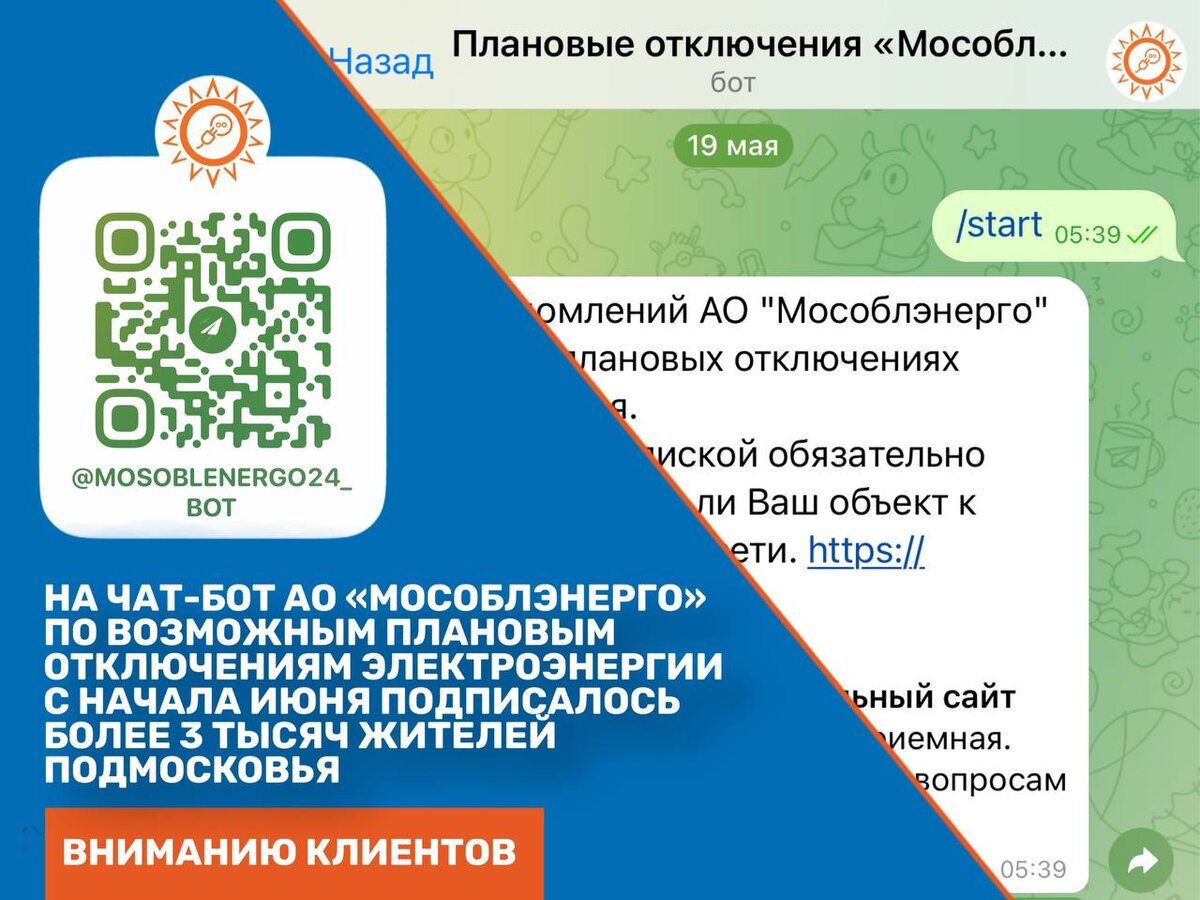 Подписаться на чат-бот можно по ссылке https://t.me/Mosoblenergo24_bot или через поиск по чатам в Telegram, QR-код для подключения к боту также размещен на официальном сайте АО «Мособлэнерго» в разделе «Плановые работы».