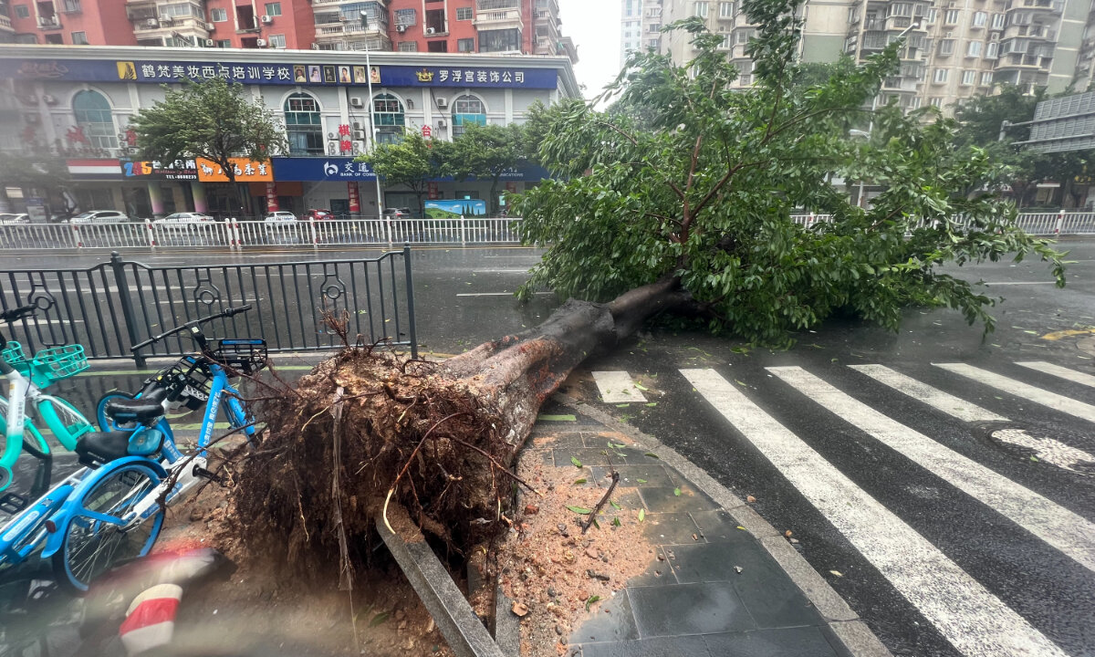 28 июля 2023 года в Сямыне, восточнокитайская провинция Фуцзянь, из-за воздействия тайфуна Доксури упало дерево. Фото: VC