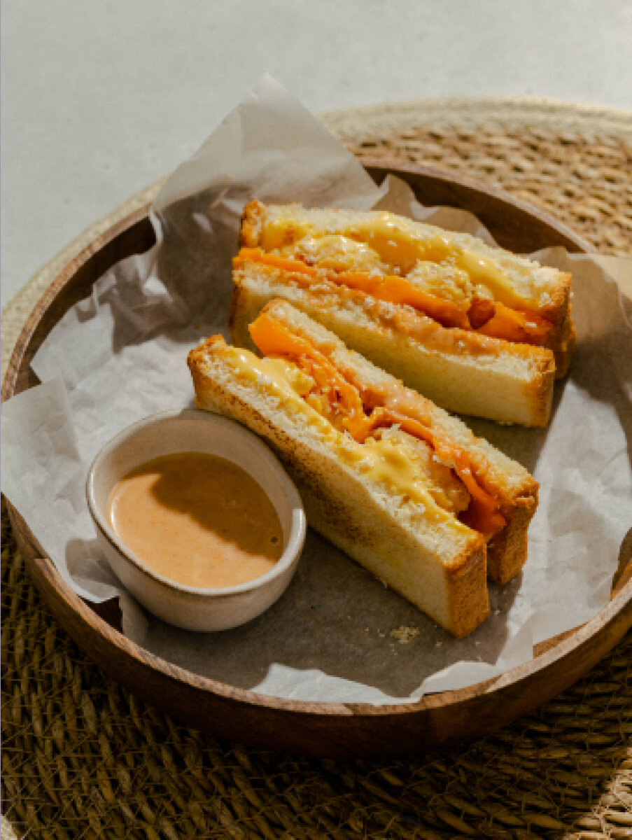 и снять с плиты лопаткой. Смазать обжаренный хлеб сырным соусом, сверху выложить креветки и сыр. Приготовить соус бэнг-бэнг, по
