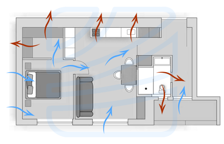 В планировке квартиры есть проходная комната, через нее воздух поступает из дальних помещений к вытяжной решетке.