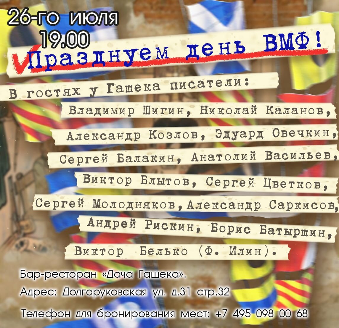Друзья! 26-го июля 2023 г. в кафе «Дача Гашека», в рамках проекта «Морская среда», состоялась встреча писателей-маринистов г. Москвы с друзьями и читателями. Она посвящалась великому морскому празднику - «День Военно-Морского Флота».