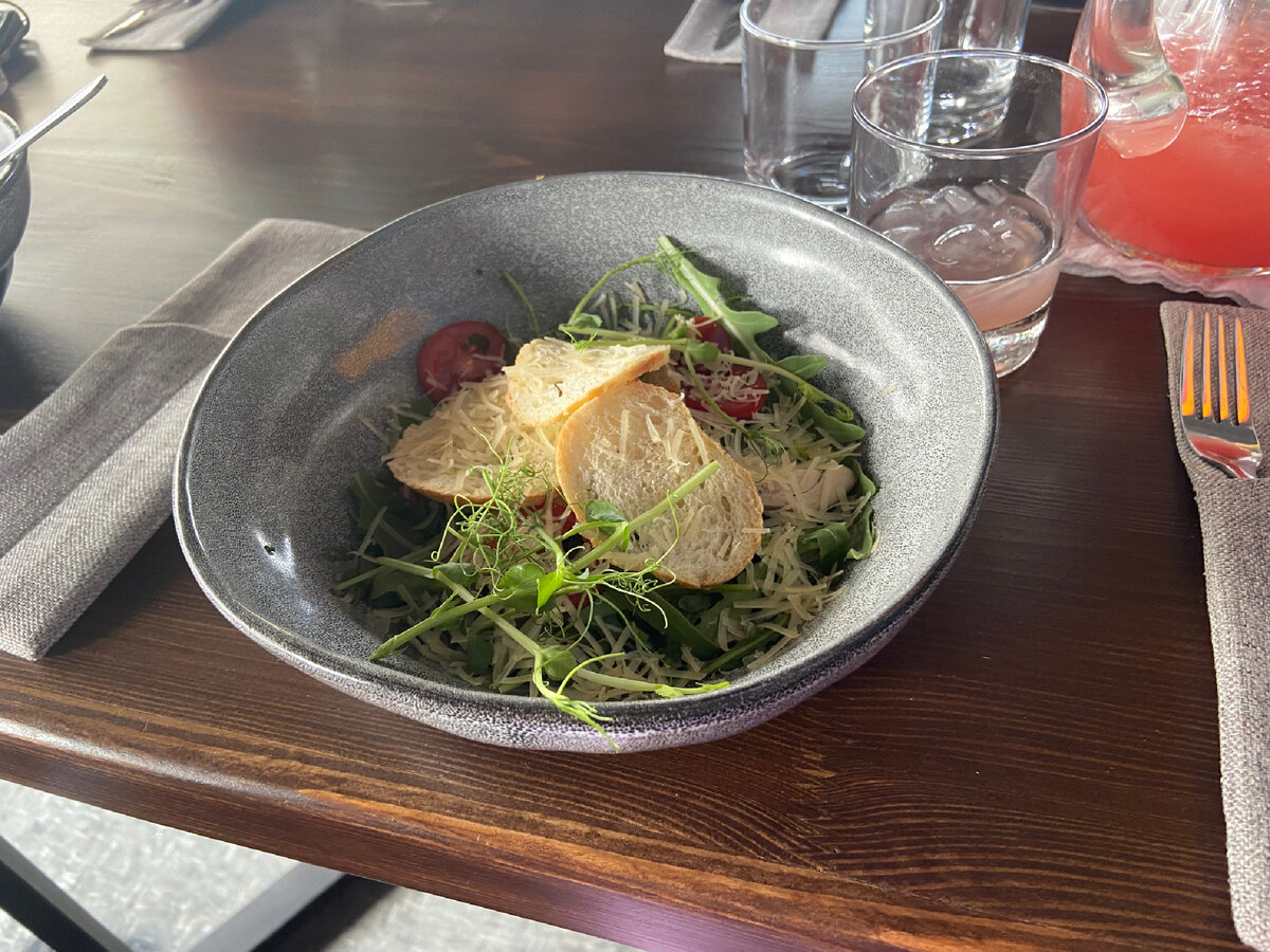 27 июля я отмечала свое 18-летие. Столик был забронирован в обеденное время. Все, что я успела сфотографировать, это был салат «Цезарь» и классический «Мохито» Салат был украшен сухарями из белого хлеба и ростками, вкус необычный, т.к салатная смесь в Цезаре была кисловата за счет рукколы, соус для Цезаря был очень вкусный, в сочетании с курицей получилось просто шикарно! Классический мохито, ничего сложного, газированный напиток, мята, лимон, и лед. При жаре 30 градусов, он точно утолит жажду. А дальше фотография с моим молодым человеком 🙃 Наевшись вдоволь в одном кафе, мы пошли кушать пиццу в «Томато» и взять освежающий напиток. И самое интересное, мы взяли пиццу « Цезарь», видимо это- самое любимое ❤️ Большая пицца, которую я еле осилила 3 кусочка, но т.к я именниница, надо было съесть этот несчастный кусочек пиццы. Ну и в конце, взяла лимонад Тархун,с большим количеством льда , чем-то напомнило мой сироп «Тархун», возможно при изготовлений коктейля, они используют сироп «Bar