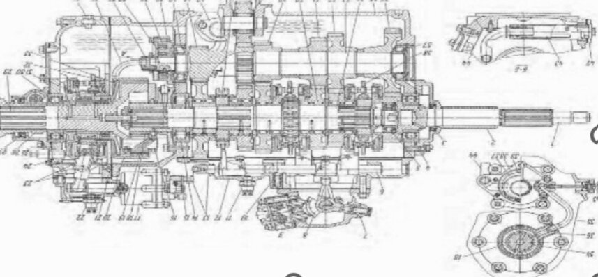 1 — ведущий вал; 2 — крышка подшипника ведущего вала; 3 — манжета; 4, 25 и 30 — шариковые подшипники; 5, 14, 48, 50 — роликовые подшипники; 6 — стержень переключения передач; 7 — фиксатор; 8 — рычаг включения передач; 9 — блок клапанов включения демультипликатора; 10 — фиксатор штока; 11 — включатель фонарей заднего хода; 12 — крышка коробки передач; 13 — стержень, блокирующий включение передач; 15 — шток поршня; 16 — ось сателлита; 17 — цилиндр пневматический; 18 — солнечная шестерня; 19 — сателлит; 20 — коронная шестерня; 21 — блокирующий диск; 22 — датчик; 23 — вилка включения демультипликатора; 24 — картер демультипликатора; 26 — шестерня привода спидометра; 27 — крышка подшипника вала-демультипликатора; 28 — фланец; 29 — вал демультипликатора; 31 — втулка шлицевая; 32 — синхронизатор в сборе; 33 — ступица коронной шестерни; 34 — пробка сливного отверстия; 35 — трубка нагнетающей магистрали масляного насоса; 36 — крышка подшипника; 37, 38 — ведущая и ведомая шестерни масляного насоса; 39 — корпус масляного насоса; 40, 57 — роликовые конические подшипники; 41 — шестерня «ползущей» передачи; 42 — крышка маслоприемника; 43 — сетчатый фильтр; 44 — трубка всасывающей магистрали; 45 — пробка отверстия для контроля давления масла; 46 — муфта включения «ползущей» передачи и заднего хода; 47 — промежуточная шестерня заднего хода; 49 — шестерня 1-й и 5-й передач; 51 — шестерня 2-й и 6-й передач; 52 — шестерня 3-й и 7-й передач; 53 — промежуточный вал; 54 — ведомый вал; 55 — картер коробки передач; 56 — шестерня постоянного зацепления; 58 —
