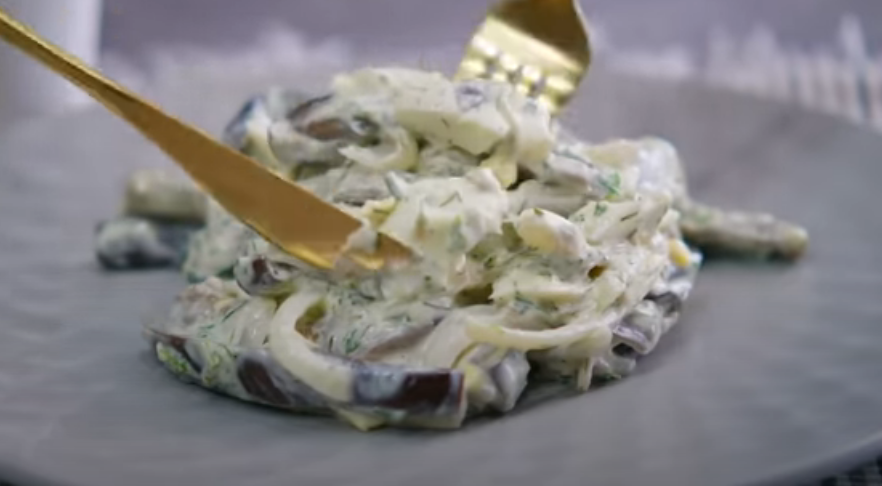 Необыкновенно вкусный и оригинальный салат можно приготовит из баклажан, при том, что сейчас сезон. Этот салат можно приготовить как для своей семьи, так и на праздничный стол. И он так быстро разлетается, что надо приготовить побольше, так как народ просит добавку. Калорийность этого салата невелика, 147 Кк на 100 граммов. Ингредиенты: 1) Баклажан, нарезанный соломкой 7 - 8 см в длину - 500 г 2) Лук репчатый, нарезанный перьями - 120 г 3) Масло растительное - 10 г 4) Яйцо куриное, нарезанное полукольцами - 3 шт. 5) Зелень укропа, нарезанная мелко - 10 г 6) Майонез - 2 столовые ложки 7) Соль - по вкусу Для маринада: 1) Кипяток - 100 г 2) Уксус 9% - 3 столовые ложки 3) Сахар - 1 столовая ложка 4) Соль - 0.5 чайной ложки Приготовление: 1) Подготовленные баклажаны сложить в глубокую миску, добавить 1 чайную ложку соли, перемешать и оставить, чтоб брусочки пропитались солью. 2) Подготовим маринад: в другую миску вольем кипяток, уксус, соль, сахар, хорошо перемешаем, чтобы соль и сахар раст
