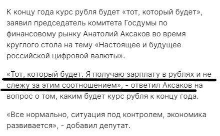 На вопрос о том, каким будет курс рубля на конец года, Аксаков ответил: "Тот, который будет. Я получаю зарплату в рублях и не слежу за этим соотношением". И добавил: "Все нормально, ситуация под контролем, экономика развивается".