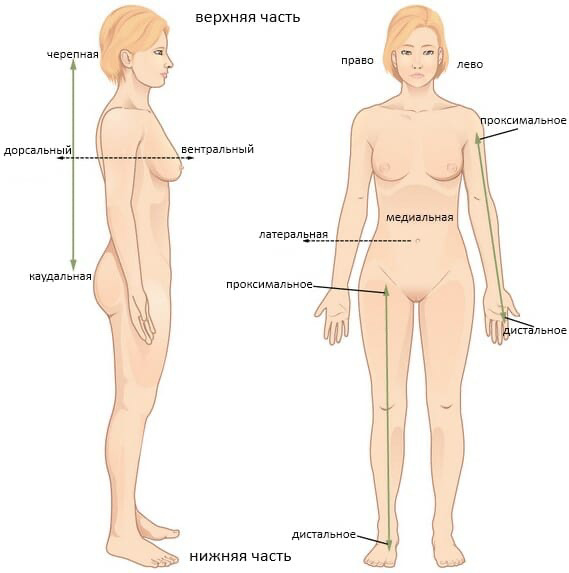 Минутка терминологического ликбеза Точки отсчёта Все движения изначально рассматриваются из анатомической позиции — вертикального положения, обращённого лицом к зрителю, стопы на ширине таза и параллельно друг другу, руки обращены ладонями вперёд. В биомеханике и анатомии также применяются термины в отношении расположений тех или иных частей тела относительно друг друга, рассмотренные ниже: Туловище человека разделено на два конца — краниальный (черепной) и каудальный(или «хвостовой», нижний). Так, грудная клетка расположена краниальнее (выше) таза, а колени каудальнее (ниже). Брюшная поверхность называется вентральной, спинная — дорсальной. Так, органы брюшной полости расположены вентральнее позвоночника и дорсальнее белой линии живота. Левая часть тела называется синистральной, правая — декстральной. Печень декстральнее желудка :Р То, что расположено ближе к туловищу — расположено проксимально. Что отдалённее от центра туловища — дистально. Локоть проксимальнее запястья, а кончики п