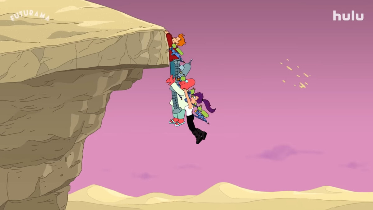 А может, люди тогда просто были как-то наивнее, что ли. В этом усталом и сложном мире 2023-го (или 3023-го) уже не получается рассмешить, показав фигу в кармане. И «Футурама», стараясь соответствовать, пускается ещё и вовсю «пост-пост-мета-мета». Шутки про жадную контору Fulu, которой заправляют тупые роботы, — галочка. Пародия на «Дюну» и «Черное зеркало» — пожалуйста. Шутки про «я чувствую себя, как будто нам устроили ребут» — чек. Наконец, даже оболтус Фрай говорит, что «не следует перезапускать сериал, если не уверен в качестве». Таких постмодернистских тейков раньше было куда меньше. С одной стороны, это как будто бы авторы машут зрителю из-за четвёртой стены — эй, ребята, мы тут и понимаем ситуацию, но давайте ещё немного повеселимся вместе. А с другой — ну невозможно тоже сплошь ехать на этой самоиронии бесконечно; слишком сильно она отдаёт жалостью к себе.