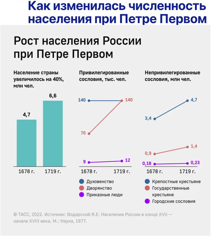 Добавлю от себя, что сам по себе рост населения не означает, что жить в этот период было хорошо или хотя бы сносно. Однако и обвинять Петра I в какой-то особенной свирепости, выходящей за рамки необходимой для правителя крупной державы 18-го века, у нас оснований нет.