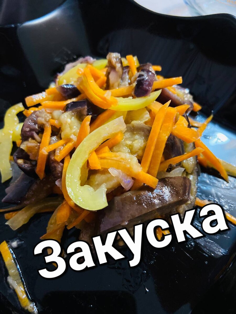 Ингредиенты: Баклажаны 3 штуки Одна морковь крупная Лук репка одна штука Чеснок Растительное масло Уксус 9% Специи любимые Способ приготовления: С перва порезать баклажаны полукольцами и посолить что бы вышла горечь, через 10 мин промыть под холодной водой отжать слегка от влаги, далее обжарить на растительном масле и в процессе добавить лук репчатый нарезаный полукольцами всё это довести до готовности в течении 5 мин. Отставить в сторону. Дальше взять два болгарских перца один зелёный другой красный для (красоты) порезать соломкой, одну крупную морковку порезать тоже соломкой и смешать все ингредиенты, после 4 или 5 зубочков чеснока натереть и добавить ту да же, зелень по вкусу. Маринад: Отдельно на сковороде нагреть 100 мл масла растительного, добавить две столовых ложки уксуса 9%, этим маринадом залить овощи а после добавить любимые приправы по вкусу, перемешать и выложить в контейнер с крышкой и отправить в холодильник на 5-6 часов. Дальше пальчики оближешь.