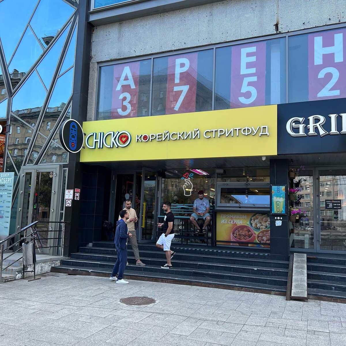 Корейское стридфуд-кафе CHICKO открылось без малого год назад и прославилось огромными очередями на улице. Это франшиза московской сети. Очереди случаются и до сих пор. Интерьер симпатичный, в стиле k-wave. Музыка звучит соответствующая — k-pop. Одним словом, модное молодёжное место. При заказе выяснилось, что части блюд нет в наличии. Например, омук — блинчиков из рыбной муки, которые накалывают гармошкой на шпажки и подают с бульоном. Не было и тайяки — рыбок из теста с начинкой, и некоторых десертов. Это минус. Пришлось брать один из мини-сетов. Мини-сет Перекус на Мёндоне по 410 ₽(рядом зачёркнутая цена 975 ₽). Мёндон — главная торговая улица в Сеуле, на которой расположено большое количество точек стритфуда. Мини корн-дог с сосиской. Треть обычной сосиски в панировке. Соус можно выбрать из нескольких, взял юдзу из кожуры цитрусового фрукта, перца и соли. Получилось удачное сочетание — лёгкий перекус, облагороженный соусом. Токпокки в остром соусе. Блюдо состоит