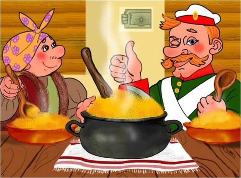 Старик шёл на побывку, устал. Дверь открыла старуха: – Пустите отдохнуть человека! Старый солдат входил и просил у старухи перекусить чего-нибудь ; она его угощала — так уж получилось, что он был сиротой (на самом деле старушка сама ещё ничего не готовила). А то бы я сейчас голодная сидела да с топором под лавкой возилась...