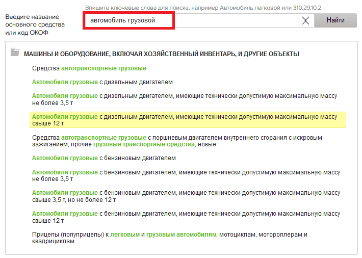 Из предложенного списка необходимо выбрать параметры, соответствующие искомому объекту. Сервис определит амортизационную группу, код ОКОФ и срок полезного использования: