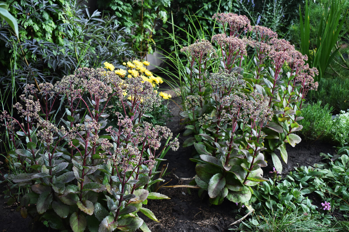 Мои любимые очитки с каждым днем все красивее. А какие краски! Вот краснеющая листва, а ниже фиолетовая, зеленая. Когда бутоны распустятся, то станут заметны различия и в расцветке цветков. Парочку сортов-первогодок особенно жду, потому что интересно, каким же будет их цвет.