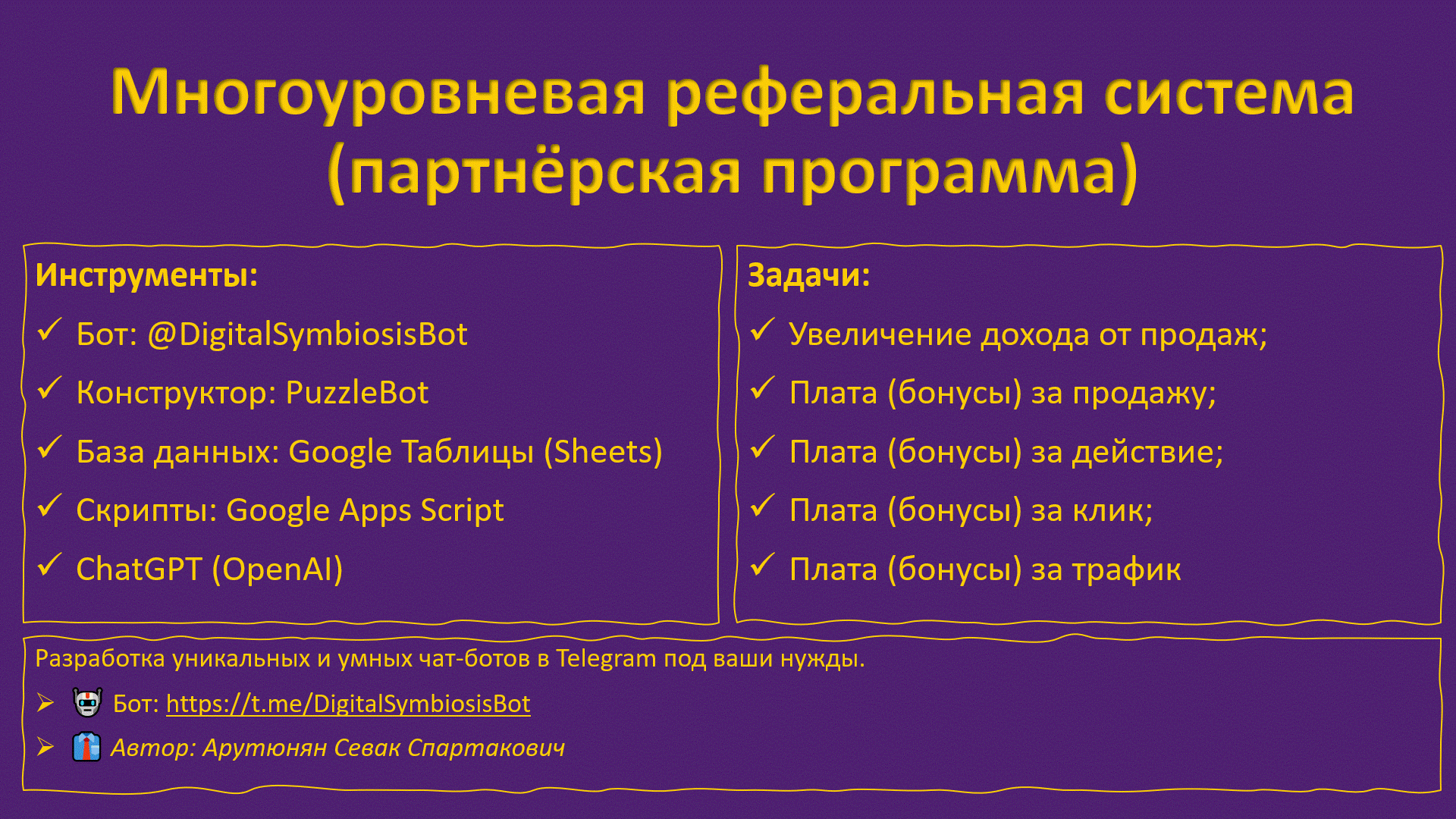 🎥 Смотрите видео на YouTube 🤖 Протестировать в боте Инструменты: Задачи: Кто есть кто? 🎥 Смотрите видео на YouTube 🤖 Протестировать в боте Я попросил ChatGPT (OpenAI) дать 10 преимуществ реферальной системы: 🎥 Смотрите видео на YouTube 🤖 Протестировать в боте Я попросил ChatGPT (OpenAI) дать 7 недостаток реферальной системы: 🎥 Смотрите видео на YouTube 🤖 Протестировать в боте Подведём итоги и сделаем выводы ✅ Это действительно выгодно! Вы не тратите средства на привлечение новых пользователей, а предоставляете возможность существующим пользователям привлечь новых клиентов в обмен на подарки или долю прибыли. Можно бесплатно, не вкладывая ресурсы и время, за бонусы и подарки привлекать новых пользователей в свой канал, чат, бот с помощью реферальной системы. 👔 Бесплатный отдел маркетинга! Подписчики отправляют ссылки лично знакомым, либо размещают в чатах, где состоят. Таким образом, они привлекают аудиторию, фактически выполняя работу маркетингового отдела. ⚠ Осторожно! Важ