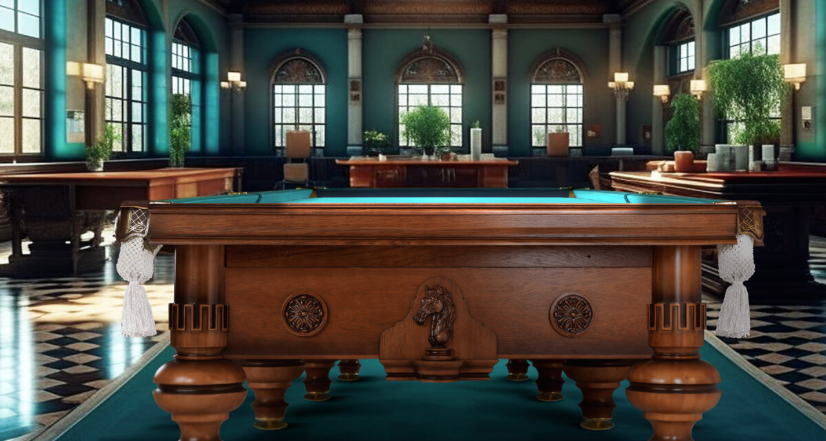 Центральной фигурой, безусловно, является бильярдный стол. Художественная ценность стола заключается в четком ритме резных шахматных фигур, строгих пропорциях, комбинации фактур разных пород дерева и выразительной патинированной выкраске. В построении стола используется технология безупречного крепления борта к плите - Mount Perfect, которая гарантирует повышенную жесткость конструкции. Лузы отделаны тиснением, сетки ручного плетения. Важное дополнение – стол комплектуется столешницей.