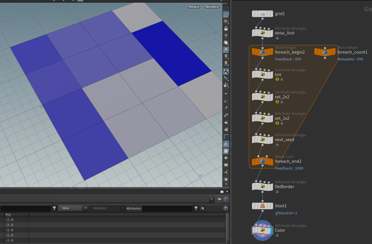 Алгоритм: Эту задачу можно сделать в одном Attribute Wrangle. Но мы вспомним правило рефакторинга: одна функция - одно действие. Поместим в Details переменные. setdetailattrib(0,"blocktype","block2x2","set");