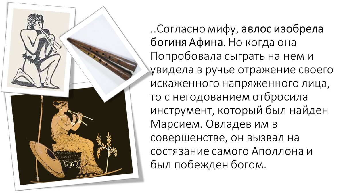 Самым распространенным духовым инструментом Др.Греции был авлос (греч. "трубка"). Главная часть инструмента - трубка цилиндрической формы (часто две). Она могла быть разной длины и диаметра. Изготавливались авлосы из тростника, лотоса, веток лавра, рогов животных, самшита и даже меди. Первоначально было 3-4 отверстия, позднее их количество достигало 15. На верхнем конце крепился мундштук с тростью (либо одинарной, либо двойной). В А Ж Н О: Авлодия начинает развиваться одновременно с кифародией. Одним из первых известных авлетов является фригиец Олимп (7 век до н.э.). В 586 году до н.э. глава малоазийской школы авлодии Сакад в Дельфах на Пифийских играх исполнил на авлосе соло, изображавшее битву Аполлона с Пифоном. Авлеты участвовали в культовых церемониях, театральных представлениях, сопровождали военные походы, но большая часть музыкантов играла в тавернах, во время застолий. Поэтому в общественном мнении античности сложился весьма нелестный портрет авлета. Пример тому двустишие