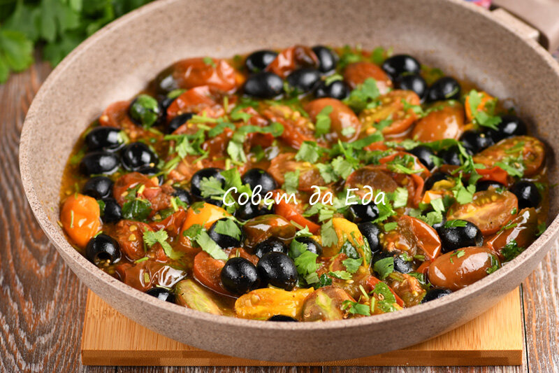 Для приготовления требуется небольшое количество продуктов, но блюдо наполеноно вкусами. На подготовку продуктов трачу 5 минут и 5 минут на приготовление. Это красивый, сочный и очень вкусный гарнир, который прекрасно подходит и к мясу, и к рыбе. За счет одного сочного овоща на дне сковороды образуется вкуснейший соус. Порции 3-4 Время подготовки 5 минут Время приготовления 5 минут Ингредиенты Инструкции 1. Для приготовления можно брать помидоры любого размера. У меня домашние помидоры небольшого размера. Разрезаем их пополам и отправляем в разогретое масло на сковороду. 2. Если готовим гарнир из больших помидоров, то разрезаем их на средние ломтики. Сковороду крышкой не закрываем, готовим на сильном огне, помешивая, 2-3 минуты. Помидоры должны стать немного мягкими. 3. Отправляем в помидоры маслины без жидкости, мелко нарезанную кинзу и перемешиваем. Если не любите кинзу, то можете ее заменить на петрушку. Но именно с кинзой блюдо получается очень вкусное и ароматное. 4. Добавляем со