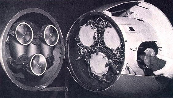Поэтому в 1940 стартовал проект "голубь". И да, это были действительно ракеты/планирующие бомбы управляемые голубем. Если быть точным, группой от одного до трёх голубей. В носовой части ракеты размещались экраны на которые проецировалось изображение. Голуби были на