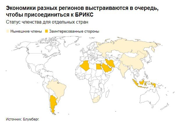Индия и Бразилия противостоят стремлению Китая быстро расширить группу развивающихся рынков БРИКС, чтобы усилить свое политическое влияние и противостоять США, сообщили официальные источники, осведомленные в этом вопросе. ▪️В число потенциальных новых членов входят Индонезия и Саудовская Аравия. Десятки других стран также стремятся присоединиться к альянсу, что подогревает опасения Запада в том, что группа становится противовесом Вашингтону и ЕС. ▪️Бразилия хочет избежать расширения альянса отчасти из-за этих опасений, а Индия хочет установить строгие правила в отношении того, как и когда другие страны могут сближаться с группой, не расширяя ее формально. Любое решение потребует консенсуса среди членов группы, встреча которых состоится 22-24 августа. ▪️🇷🇺По словам Федора Лукьянова, главы Совета по внешней и оборонной политике, консультирующего Кремль, у России нет твердой позиции по расширению БРИКС. "В целом она выступает за расширение БРИКС, но без особого энтузиазма. Он идет