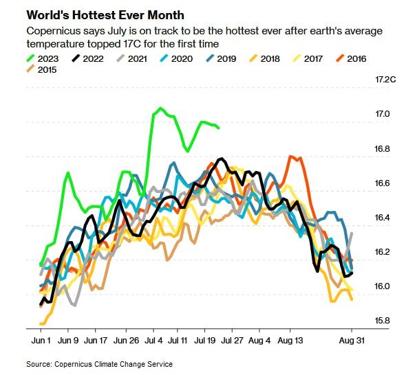 , июль стал самым жарким месяцем за всю историю наблюдений после того, как средняя температура на Земле впервые превысила 17°C.