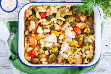 Идеальный выбор для тех, кто следит за здоровьем! ПП курица запечённая с овощами в духовке - самый полезный ужин для всей семьи, который можно приготовить очень быстро. Выбирайте любимые овощи и специи, добавляйте филе целиком или кусочками - и в духовку. Получите прекрасный полезный ужин. ИНГРЕДИЕНТЫ: ШАГ 1: Как сделать ПП курицу запечëнную с овощами в духовке? Подготовьте указанные продукты. Овощи можно брать по своему вкусу, но не выбирайте картофель. Можно взять замороженные готовые овощные смеси. От курицы возьмите куриное филе, можно взять другое куриное мясо, но без кожи. Сухие специи можно взять набором, а можно добавить те, какие нравятся.ю Оливковое масло можно заменить другим растительным. ШАГ 2: Подготовьте форму для запекания и включите разогреваться духовку до 180 градусов. Из овощей у меня в замороженном виде брюссельская капуста и зелёный горошек. Их размораживать не нужно. Добавляю их на выбранную форму для запекания. ШАГ 3: Кабачок, если молодой, то шкурку с него сним