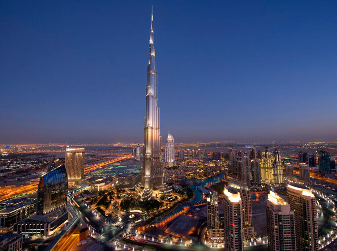 Самый невероятный небоскреб Бурдж-Халифа в Дубае Абсолютный рекорд по всем параметрам Бурдж-Халифа превосходит по высоте Эйфелеву башню в Париже в три раза, и в два раза – Эмпайр-Стейт-Билдинг в Нью-Йорке. Только представьте: алюминия, использованного при строительстве Бурдж-Халифа, с лихвой хватило бы на пять самолетов Airbus A380. Для справки: Airbus A380 способен вместить в себя около тысячи пассажиров и считается крупнейшим из ныне действующих пассажирских самолётов. Разумеется, состоит Дубайская высотка не только из металла, но и из бетона, вес которого равен весу 100 000 слонов (если уж измерять масштабы короля небоскрёбов в слонах и самолётах). А шпиль здания виден за 95 километров – иными словами, если вы соберётесь в Дубай, первое, что вы увидите из подлетающего самолёта, будет он, Бурдж-Халифа, символ роскоши и несметных богатств этих земель. 1. Самое высокое здание в мире Высота небоскрёба Бурдж-Халифа в Дубае составляет 828 метров и это высочайшие здание в мире. Рассказывае