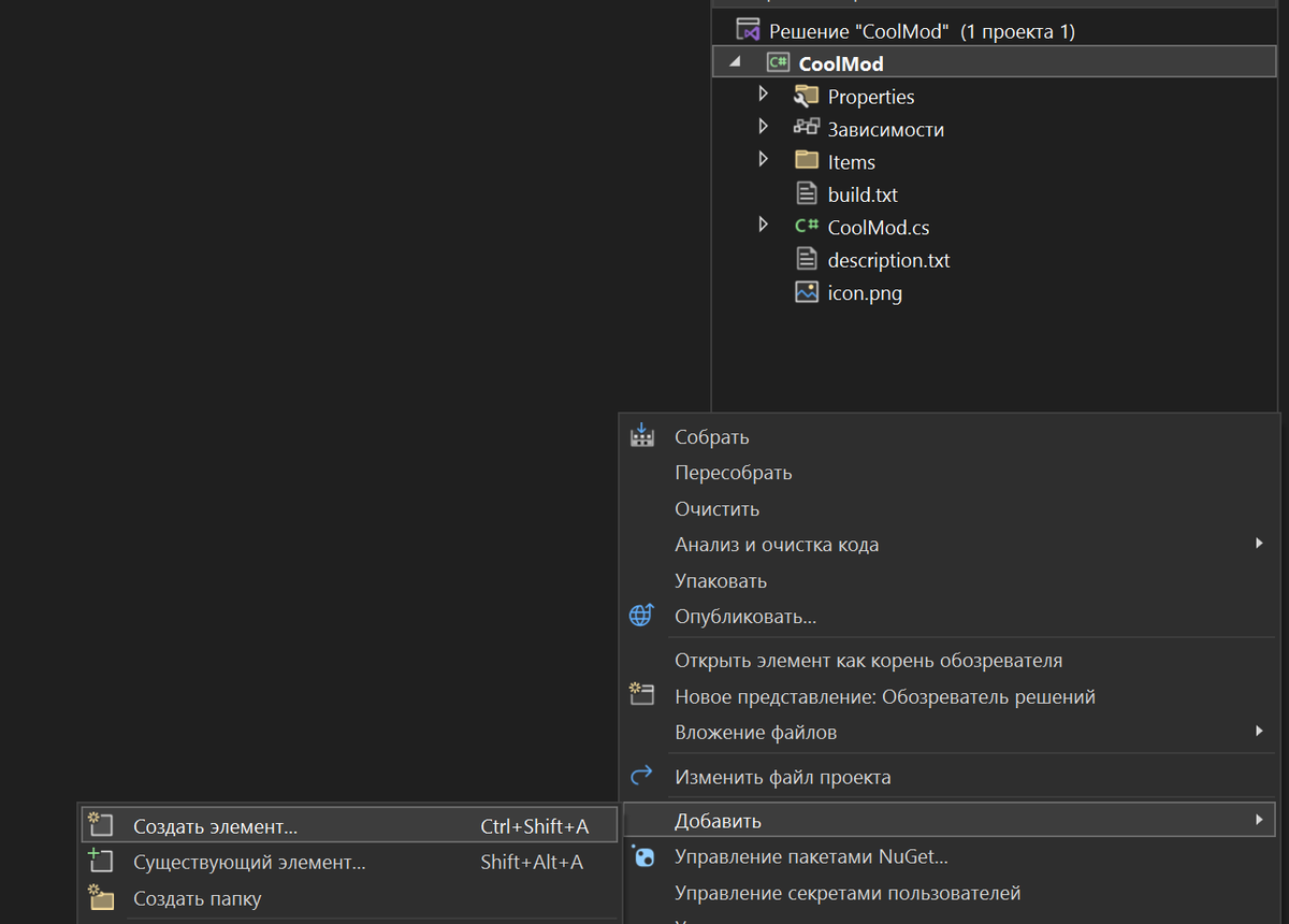 Доброго дня! Сегодня я покажу, как создать свой собственный рецепт для любой вещи в террарии и модах для неё! Настоятельно рекомендую вам становить мод RecipeBrowser, так как он здорово нам поможет в проверке работоспособности наших рецептов По старинке, открываем наш проект с помощью Visual Studio и в проекте кликаем правой кнопкой мыши -> добавить -> создать элемент Назовём его GlobalModSystem и добавим Видим следующую картину: Здесь, стираем все строчки со словом using и заменяем их на нужные нам библиотеки: А internal class GlobalModSystem меняем на