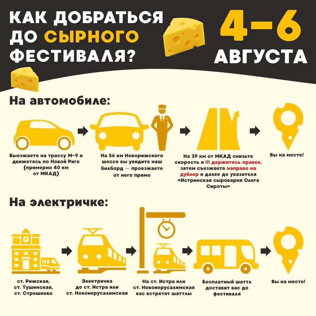 из Москвы, со станций, которые находятся рядом с м. Рижская, м. Дмитровская и м. Тушинская, ходят пригородные электрички до станции Новоиерусалимская или Истра. Там гостей будут встречать наши бесплатные автобусы-шаттлы, которые доставят прямиком на фестиваль.