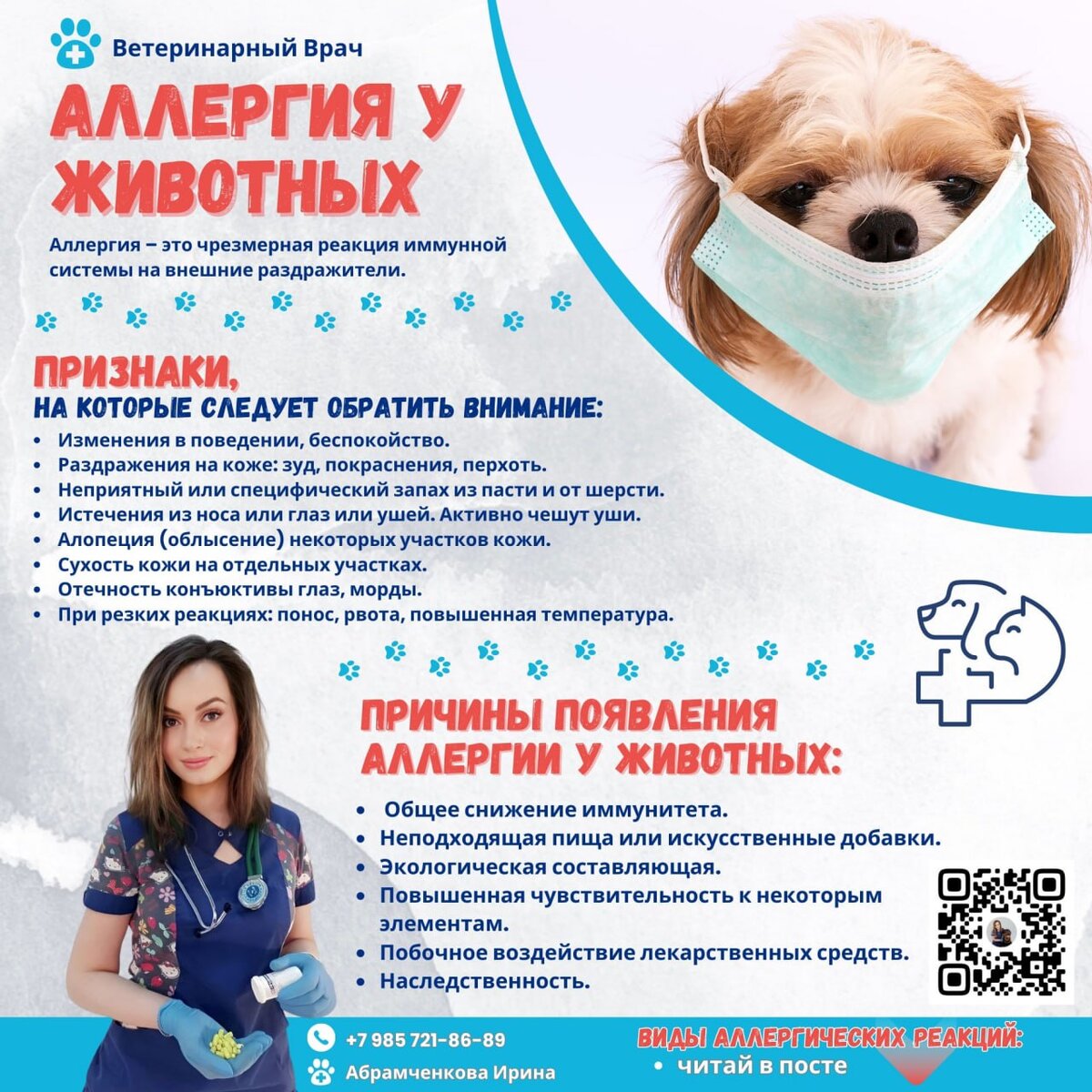 Наши питомцы часто страдают от различных проявлений аллергии. Виды аллергических реакций: Анафилактический шок Это самая опасная и практически самая мгновенная реакция организма на аллерген. Анафилактический шок может возникнуть на введение сывороток, вакцин, каких- либо препаратов, а также дачи таблеток. Укусы змей, пчел, блох. Аллергия на пищевые продукты Встречается очень часто, проявление такой аллергии у каждого животного индивидуально, тем более что и проявляется аллергия не всегда сразу, так как организму нужно время на усвоение пищи. Атопический дерматит При этом виде аллергии сложнее всего определить сам аллерген. Может возникать систематически или периодически. Реакция может возникать на пыльцу, лекарства, средства уборки, эпителий других животных, споры плесени и многое другое. Аллергия на паразитов Возникает как реакция на укусы и продукты жизнедеятельности мелких насекомых и паразитов, обитающих на самом питомце (блохи и кожные паразиты), в доме (пылевые клещи) и